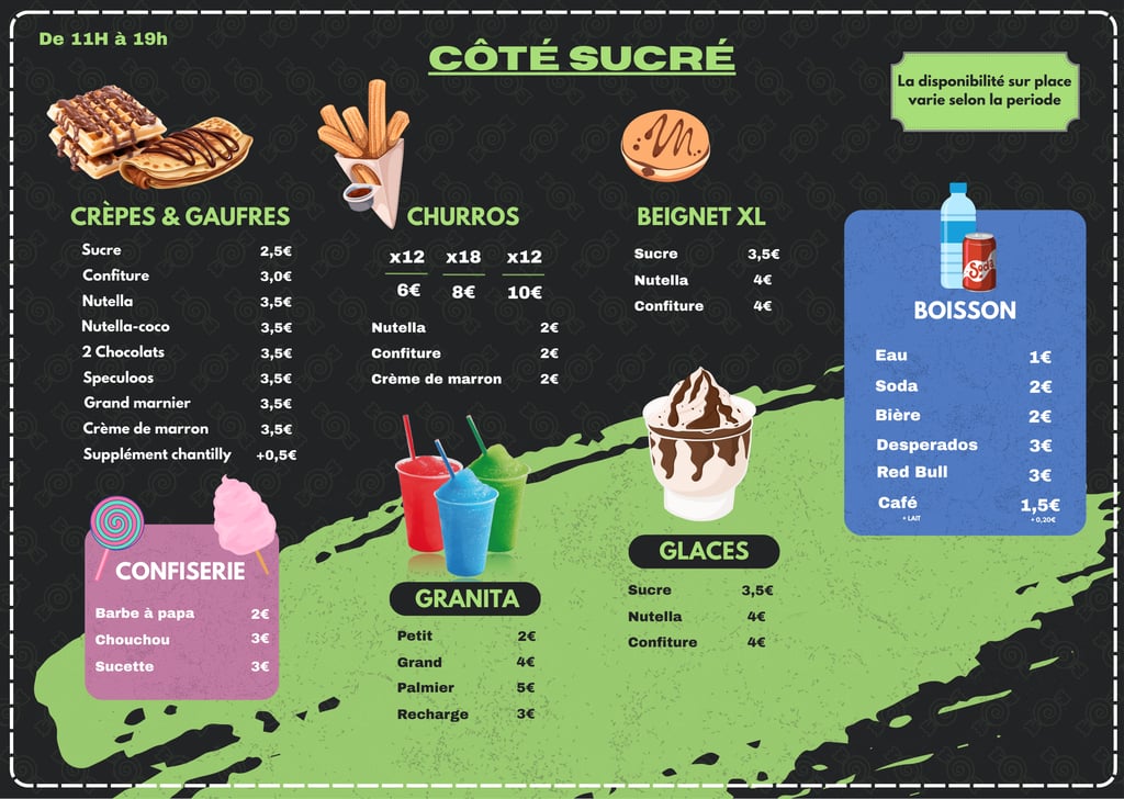 crêpes - gaufFres - churros, barbe à papa - glaces -granitas bien frais…